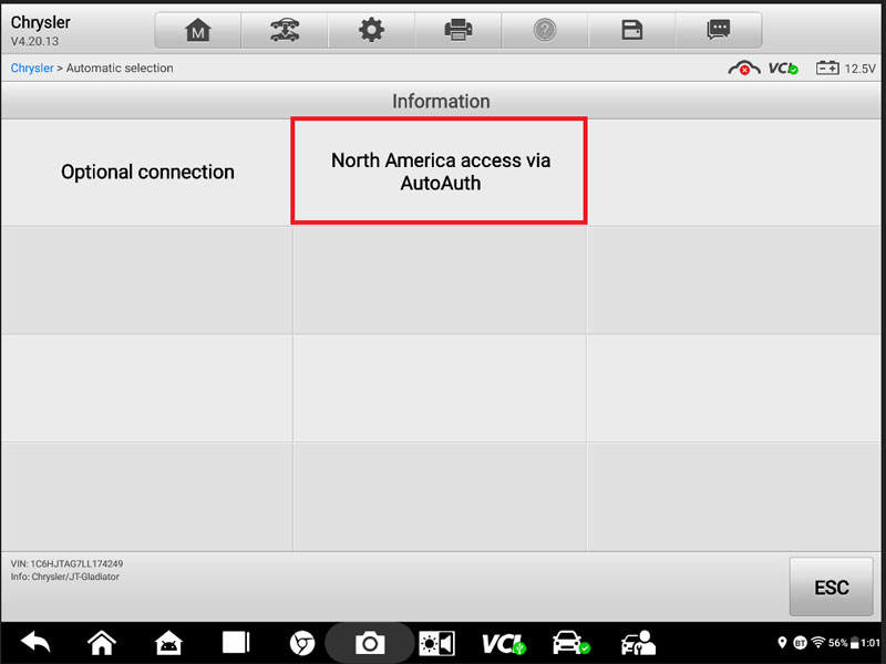 Diagnostics >> Car model >> Automatic selection >> Change >> North America access via AutoAuth >> Yes >> Enter user name & password to login