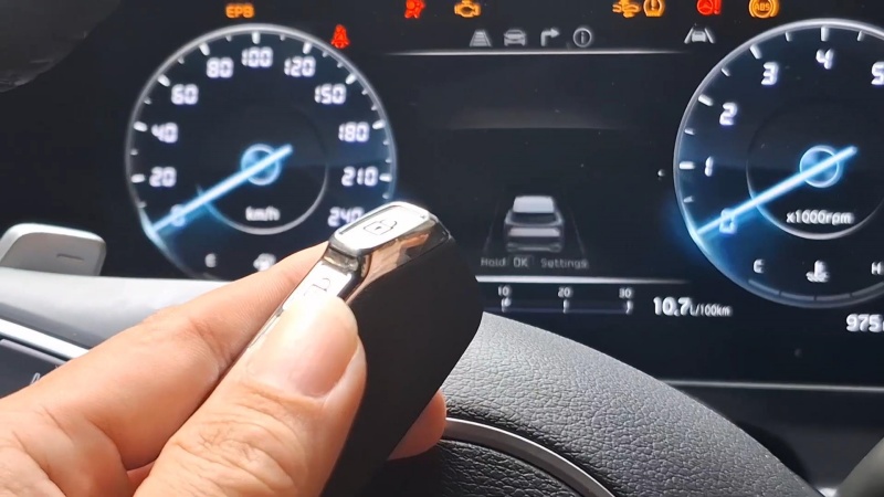 Within 5s, press the Start/Stop button with the smart key with its back or top against the button for 5s. Then the security lamp will flash.